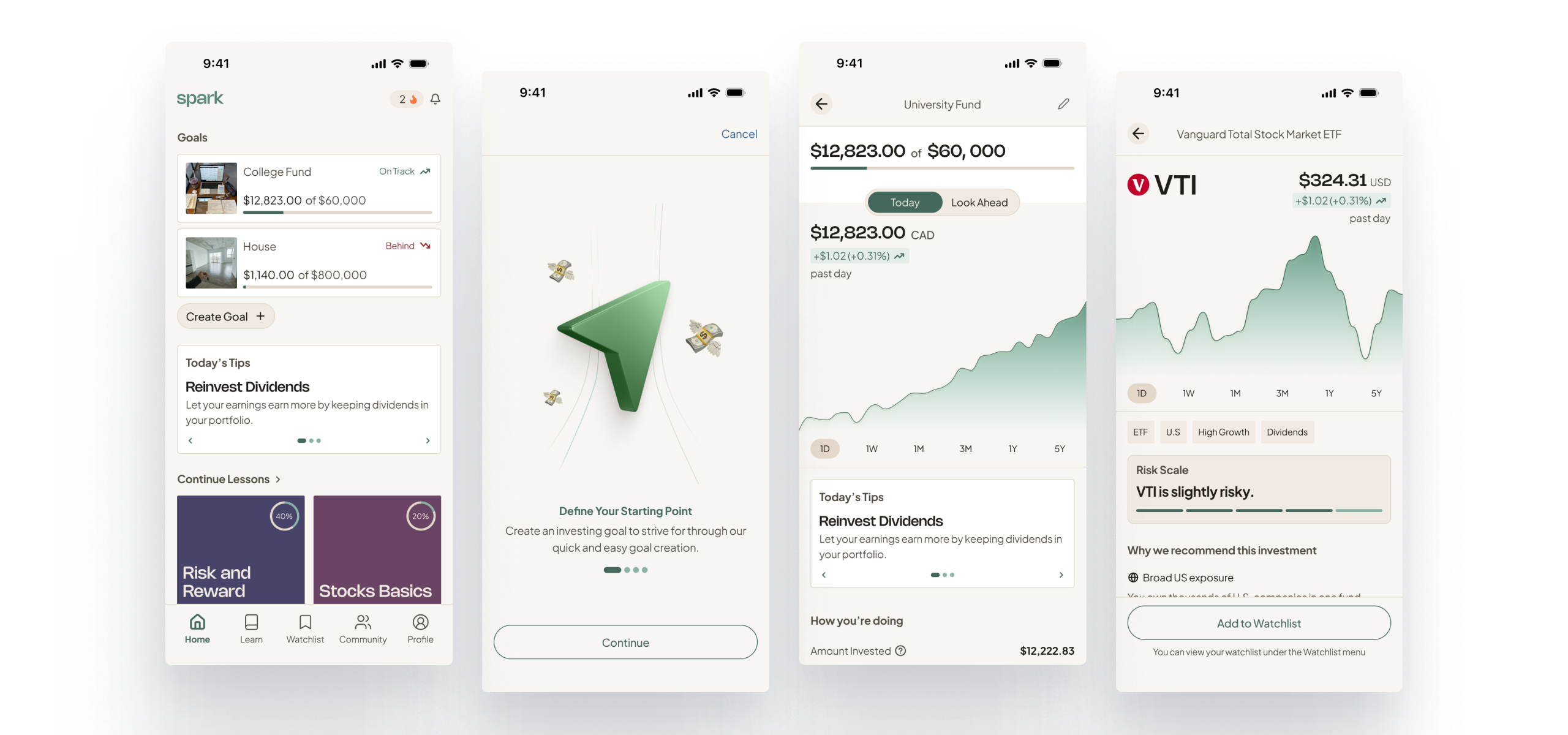 Spark is a goal oriented investing app which gives teens and young adults the confidence, knowledge, and guidance to meet their investing goals. The goal tracking feature gives users a starting point in their investing journey and helps keep them on track.
